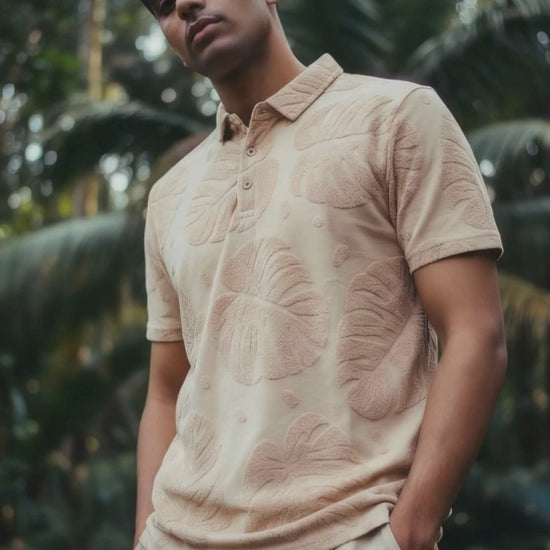 Designed in our Luxe Textures collection, this polo features a refined embossed leaf pattern crafted on premium imported towel jacquard cotton, giving it a soft yet structured textured finish. The warm Beige shade adds understated sophistication, while the 100% cotton build keeps it breathable and comfortable throughout the day.