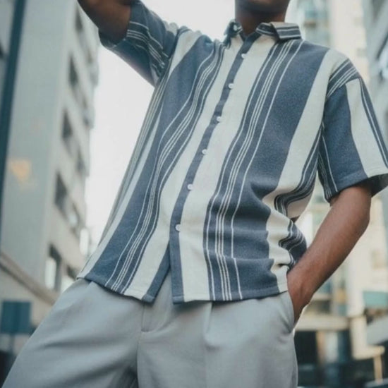 Part of our Urban Textures collection, this knit shirt is crafted from premium imported light knit jute jacquard in 100% cotton, offering a soft, breathable feel with a refined textured finish. The Stone Grey and White striped pattern brings a clean, contemporary look that transitions effortlessly from casual outings to smart-casual occasions.
